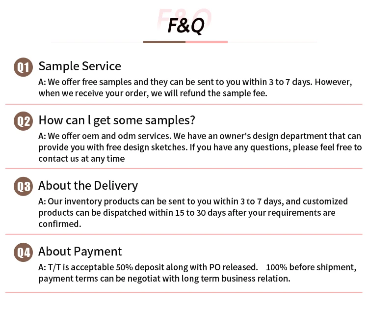 Advantage | 1. Factory direct supply, good quality, competitive price, delivery on time. 2. Small orders acceptable, OEM/ODM are welcomed. We are happy to serve low quantity customers, but if you need larger quantities of private products, Inquire and we will give you unexpected surprise! |